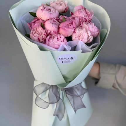 Букет из 15 розовых пионов в дизайнерской упаковке “Принцесса Маргарита”