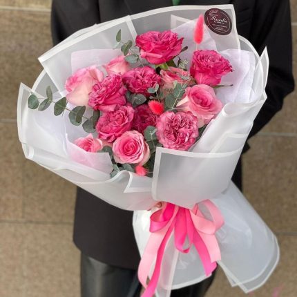 Композиция из сухоцветов и стабилизированных роз в мини шляпной коробке