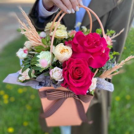Композиция в керамическом кашпо с гортензией,кортадерией,лагурусом,нигеллой,розой,пшеницей,клевером