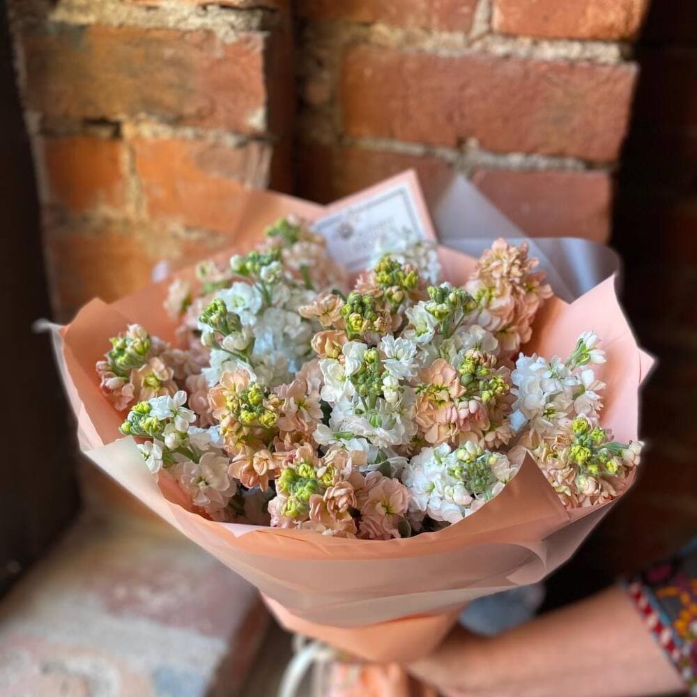 Букет из 17 белых и персиковых маттиол в дизайнерской упаковке