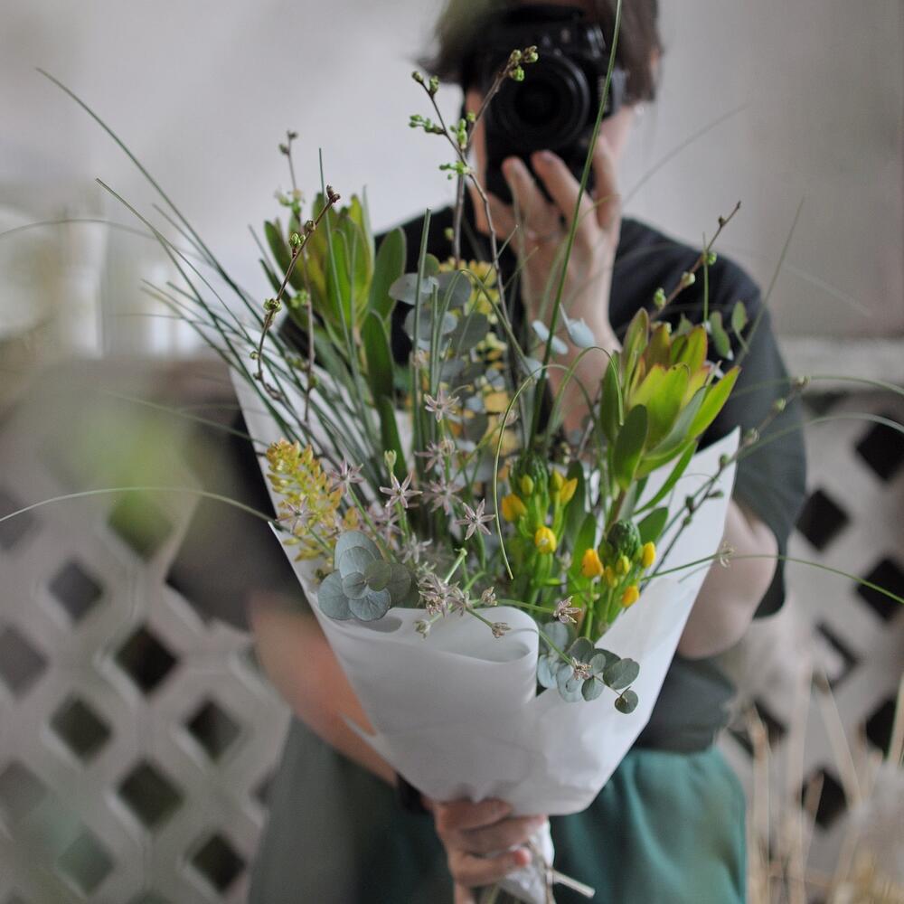 леукондендрон – 2 шт.Орнитогалум – 2 шт.Эвкалипт – 4 шт.Прунус – 3 шт.Берграсс – 3 шт.эремурус – 2 шт.Упаковка – 1 шт.Лента атласная – 1 шт.