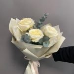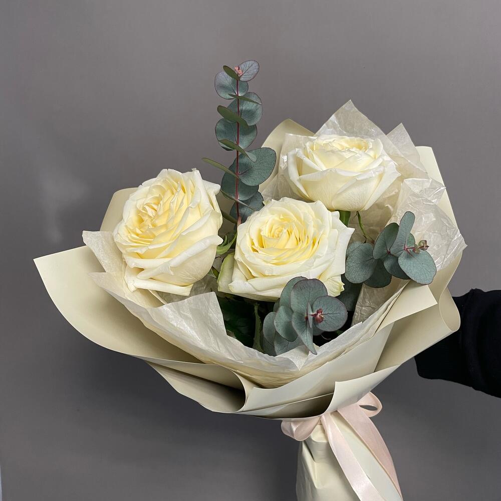 Эвкалипт – 2 шт.Лента атласная – 1 шт.Упаковка дизайнерская – 2 шт.розы кендилайт – 3 шт.