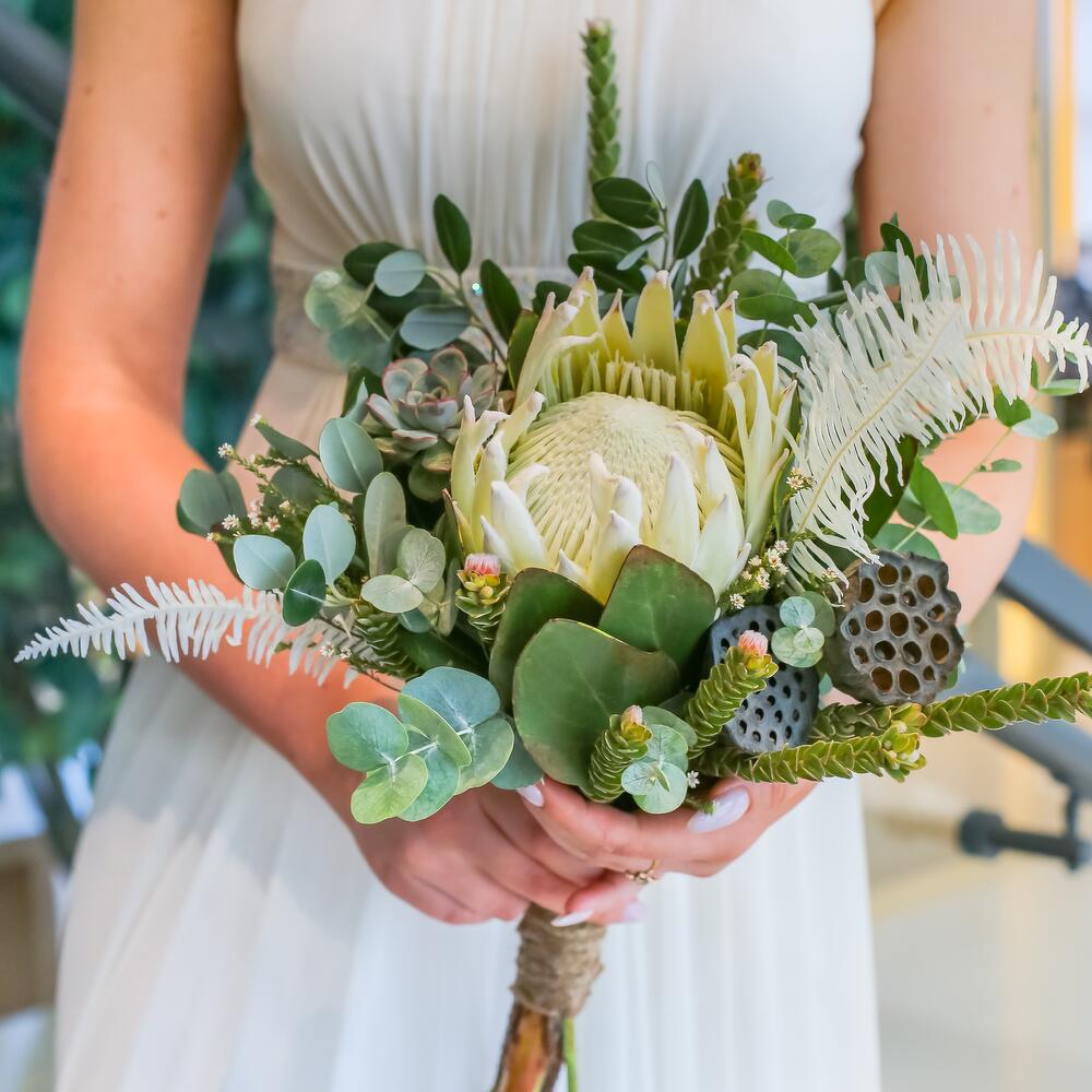 Протея королевская – 1 шт.Нелумбо – 2 шт.Эхеверия – 1 шт.Эвкалипт – 2 шт.амбрелла – 1 шт.Зелень – 5 шт.