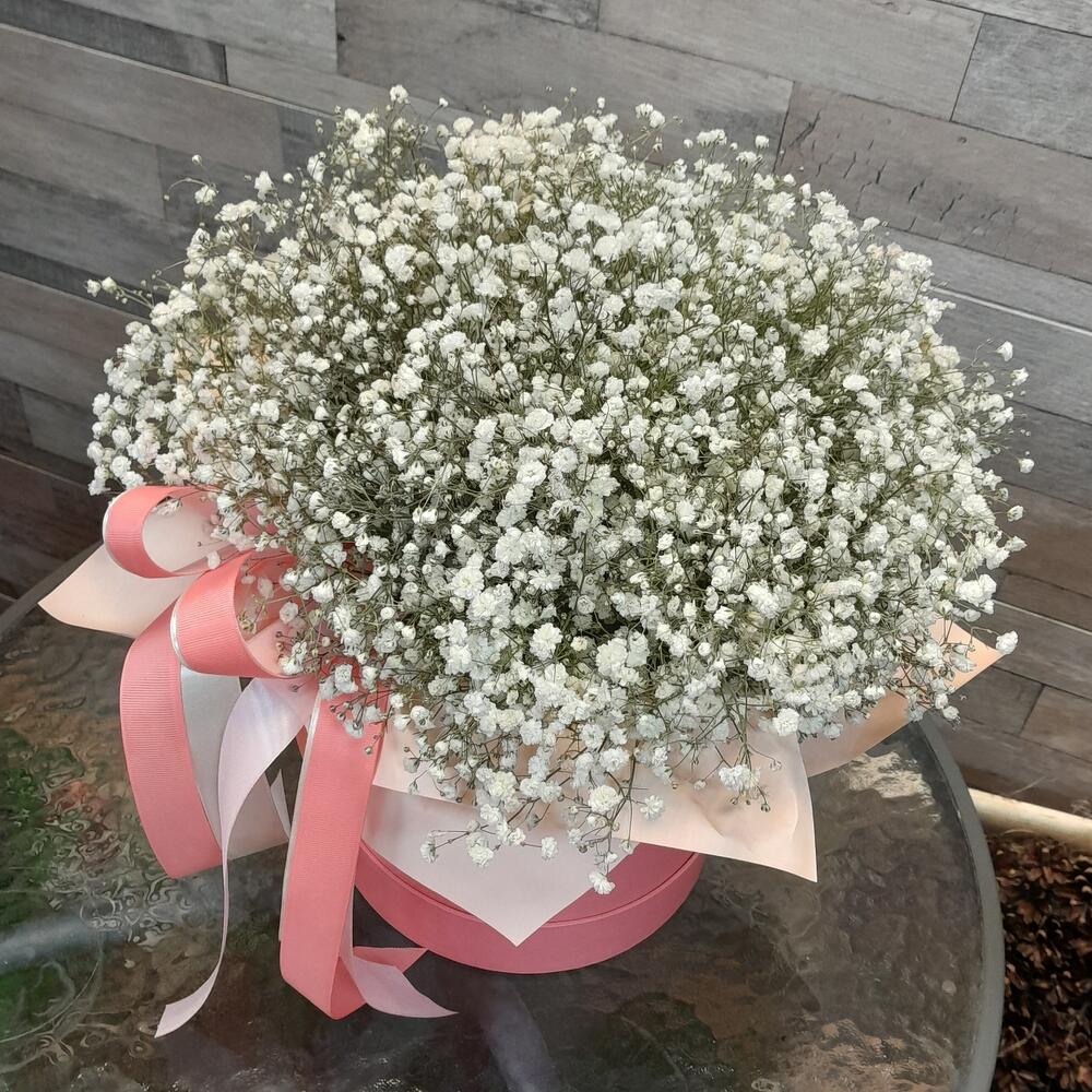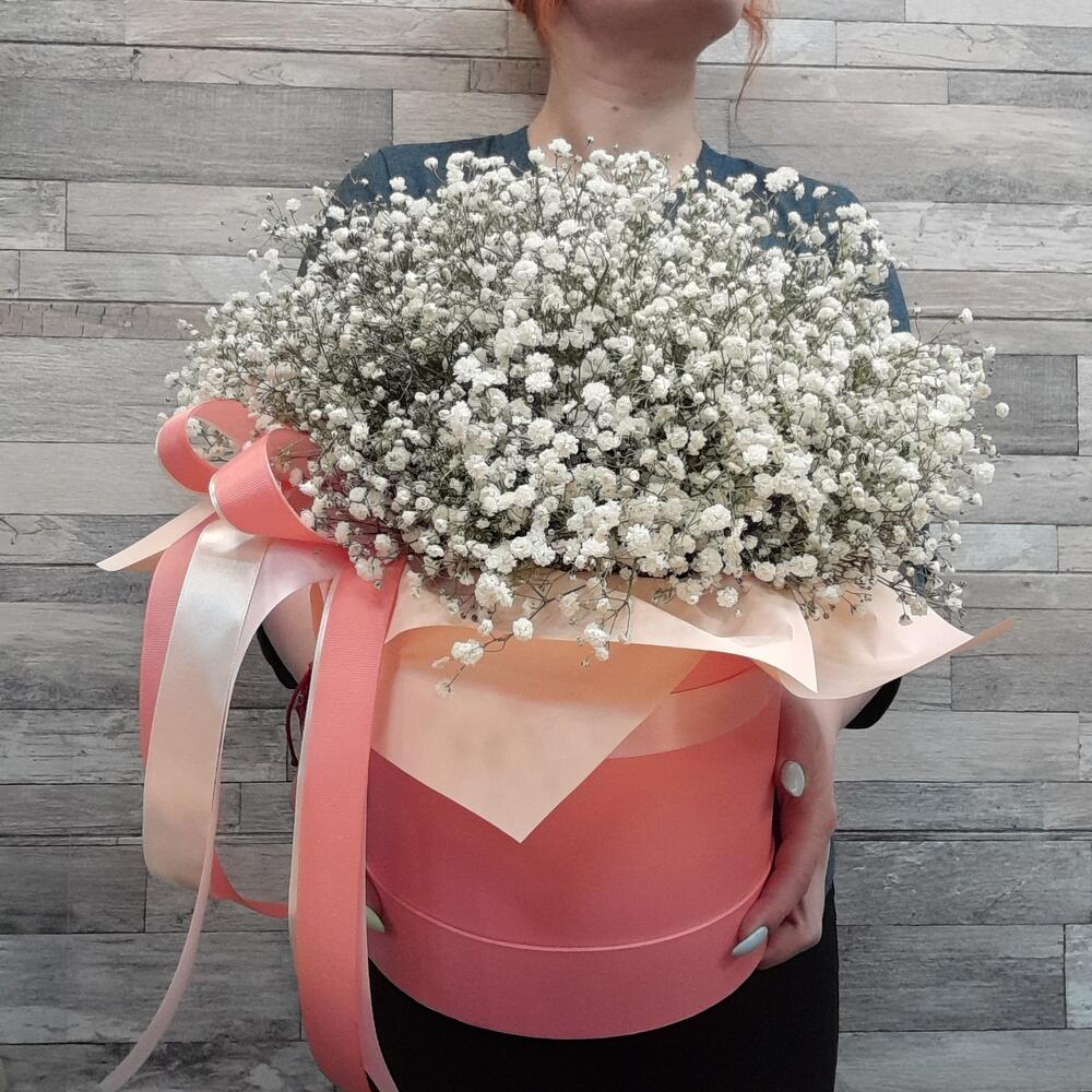 Гипсофила – 15 шт.Лента атласная – 4 шт.Шляпная коробка – 1 шт.Упаковка дизайнерская – 1 шт.Оазис флористический – 1 шт.