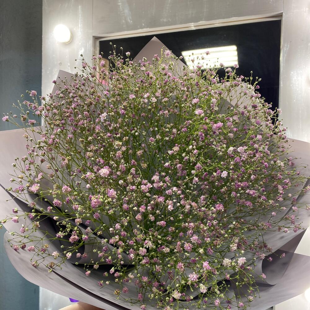гипсофила сереневая – 4 шт.Упаковка – 3 шт.Лента атласная – 2 шт.