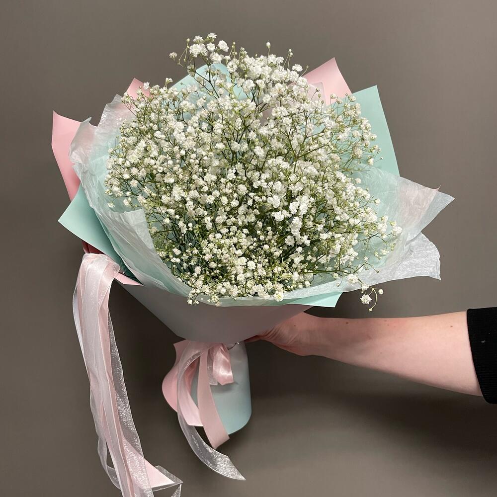 Гипсофила – 5 шт.Лента – 5 шт.Упаковка дизайнерская – 2 шт.Шар сердце – 1 шт.