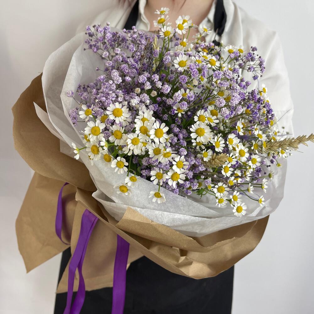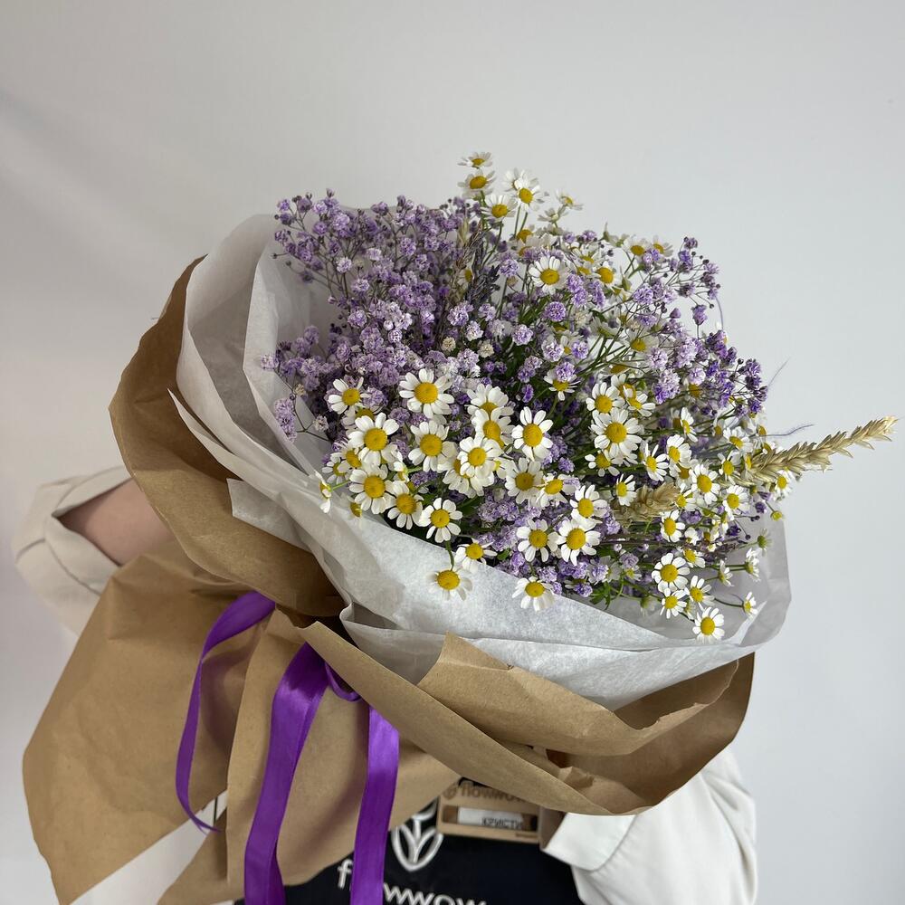 Гипсофила – 3 шт.Ромашка полевая – 5 шт.Колоски пшеницы – 3 шт.Крафт упаковка – 4 шт.тиштю белая – 2 шт.