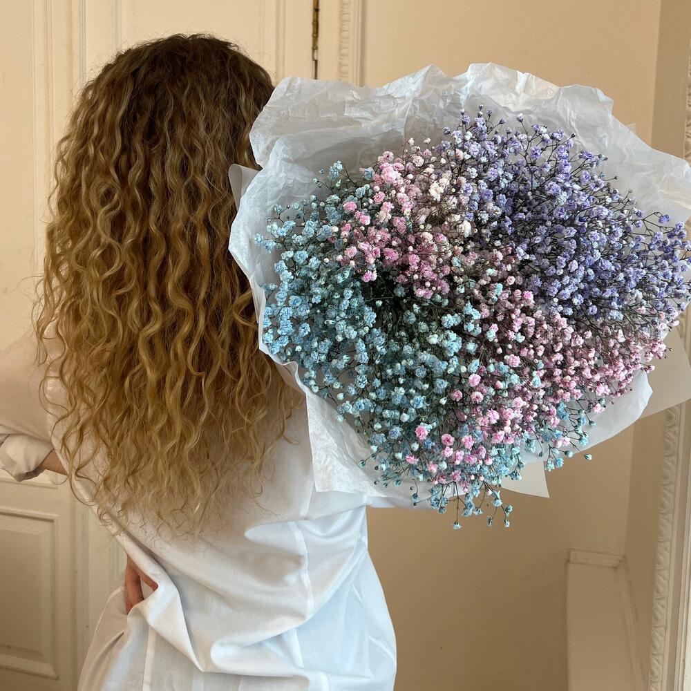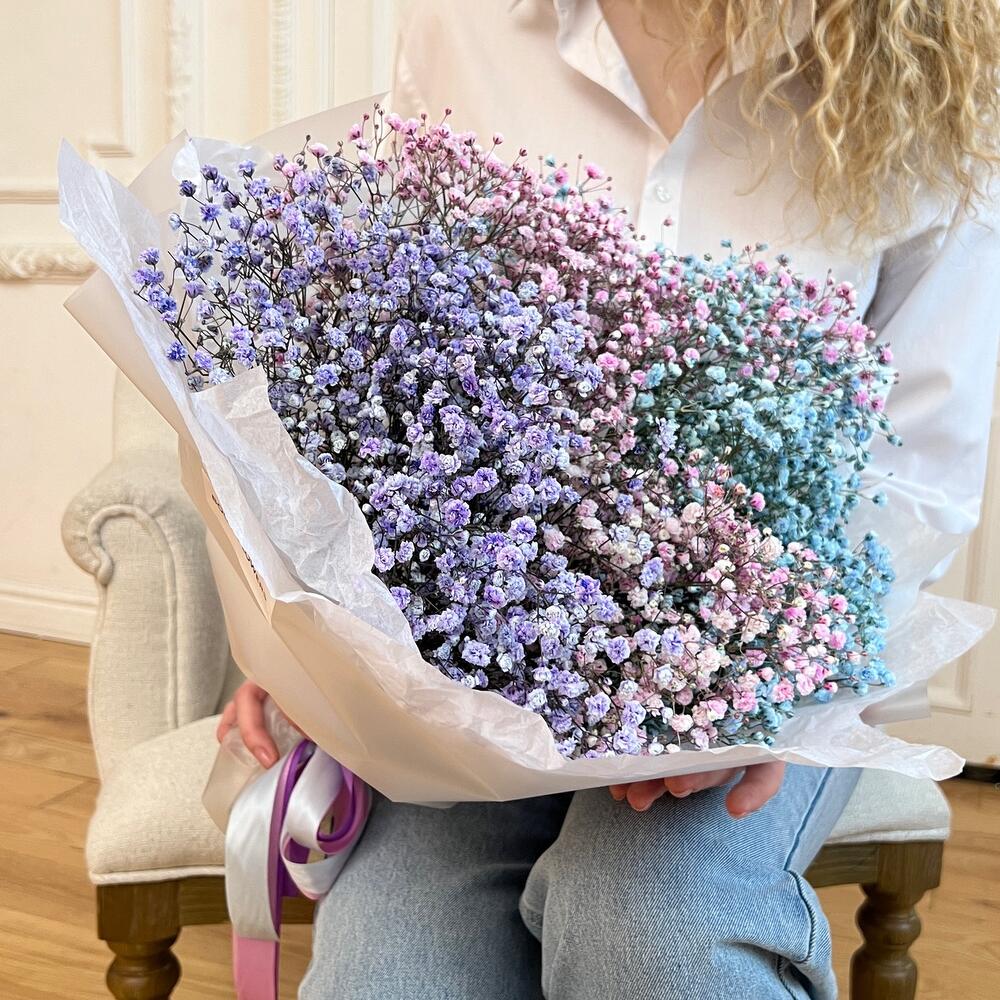 Гипсофила – 7 шт.Дизайнерская упаковка – 1 шт.Лента атласная – 1 шт.