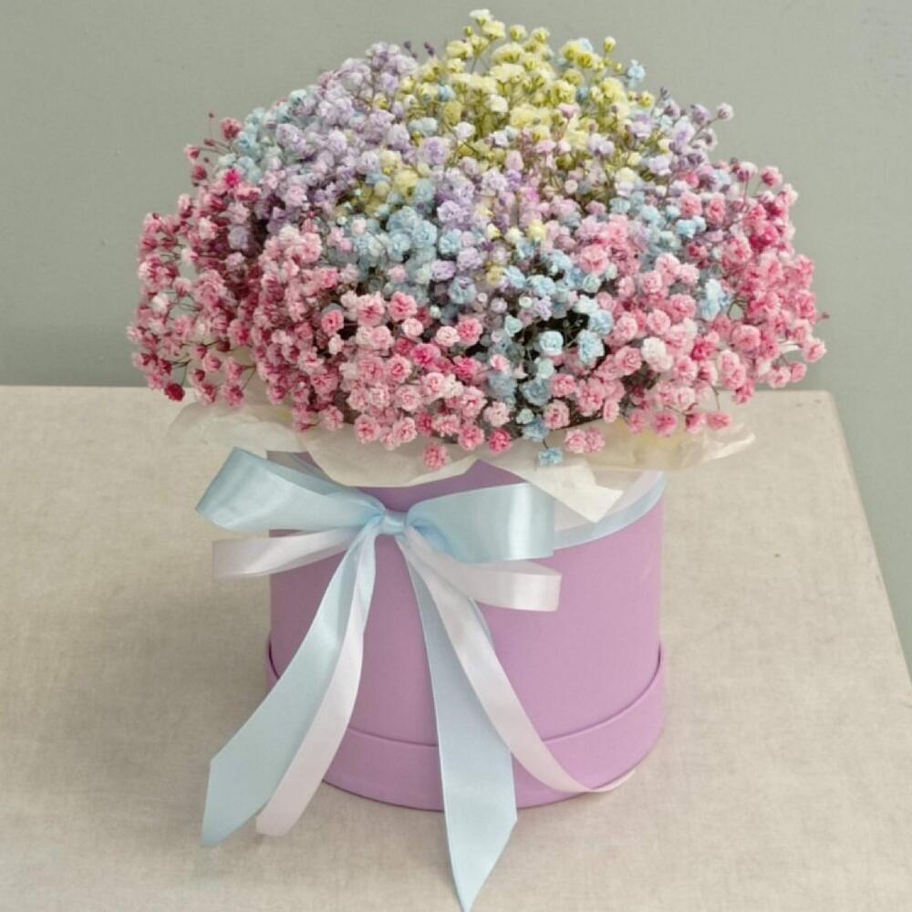“Сиреневый туман” – композиция из гипсофилы в шляпной коробке