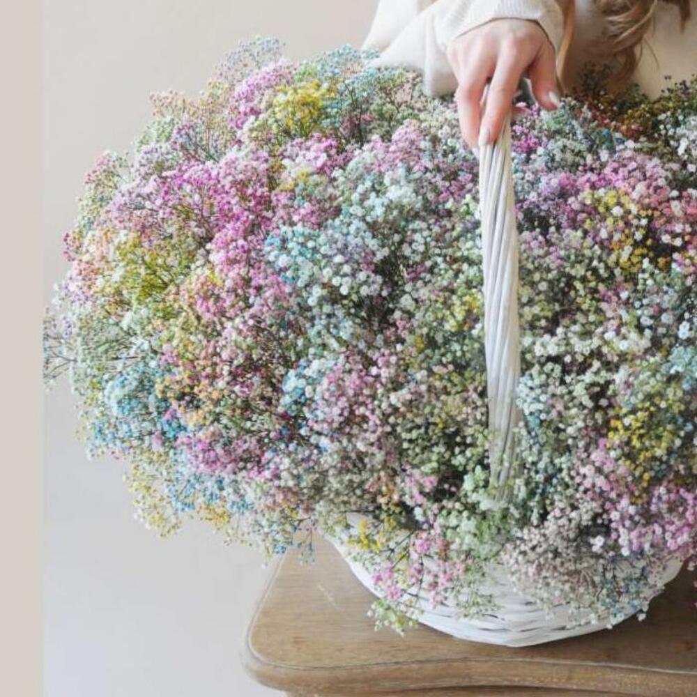 Корзина плетеная – 1 шт.Оазис – 3 шт.гипсофила радужная – 31 шт.Лента атласная – 3 шт.