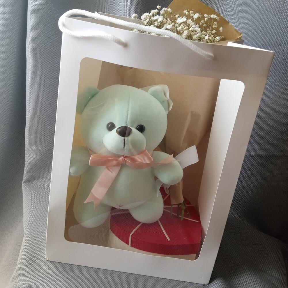 Гипсофила – 3 шт.Клубника – 250 гр.Лента – 1 шт.Голубика – 100 гр.Крафт упаковка – 1 шт.Пакет подарочный – 1 шт.Мишка плюшевый – 1 шт.коробка сердце маленькая – 1 шт.