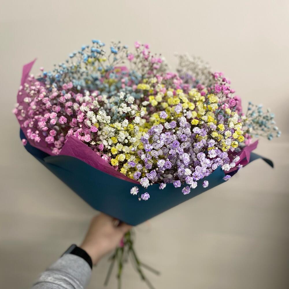 Гипсофила – 7 шт.Лента атласная – 3 шт.Тишью – 3 шт.Упаковка дизайнерская – 3 шт.