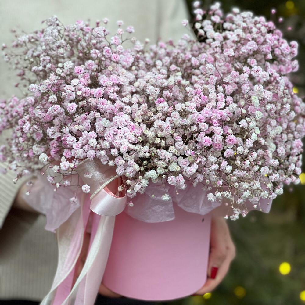 “Сиреневый туман” – композиция из гипсофилы в шляпной коробке