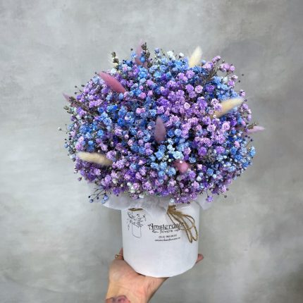 Лаванда – 9 шт. Лагурус – 9 шт. Оазис флористический – 1 шт. Гипсофила розовая – 7 шт. Коробка d15 – 1 шт.