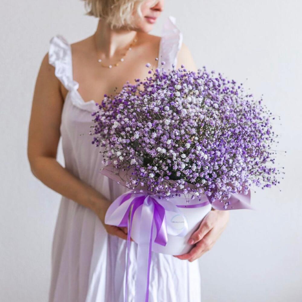 Очаровательная, воздушная композиция из гипсофилы, в шляпной коробке.Цветы стоят в специальной флористической губке,что позволяет им больше оставаться свежими и радовать получателя. Так же композиция в коробке это очень удобно и эффектно, так как не надо ставить букет в вазу и менять воду. Необходимо лишь подливать в губку воду.Инструкция по уходу за цветами прикреплена к каждому заказу.Цветы гипсофилы отличаются стойкостью и даже при высыхании не теряют, декоративности и цвета. Что позволяет, долгое время украшать интерьер в качестве сухоцветов.Подпишем открытку с вашими пожеланиями бесплатно