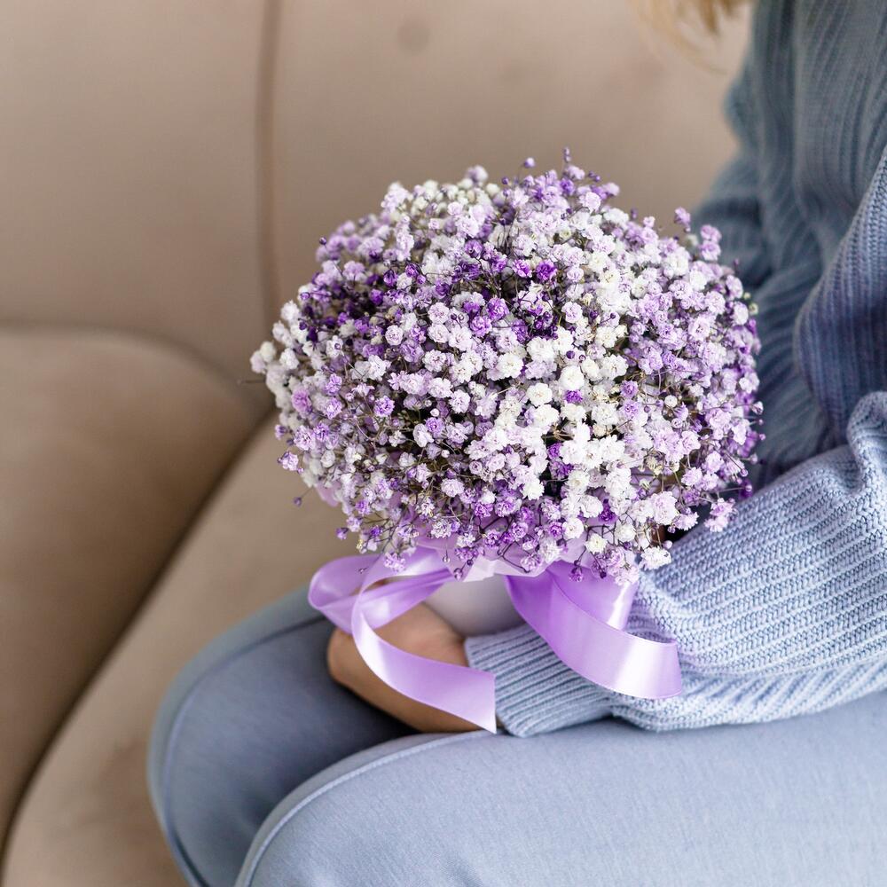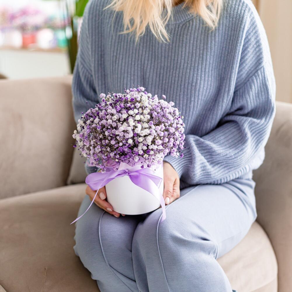 “Сиреневый туман” – композиция из гипсофилы в шляпной коробке