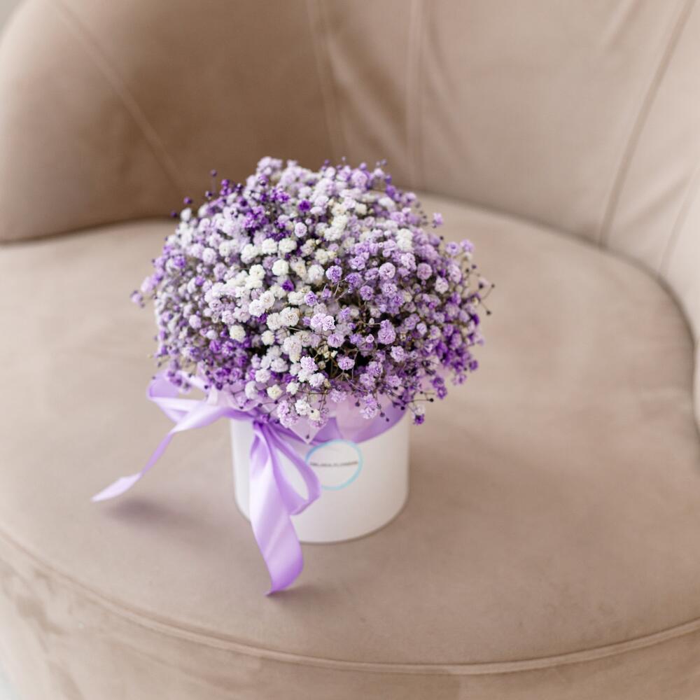 Очаровательная, воздушная композиция из гипсофилы, в шляпной коробке.Цветы стоят в специальной флористической губке,что позволяет им больше оставаться свежими и радовать получателя. Так же композиция в коробке это очень удобно и эффектно, так как не надо ставить букет в вазу и менять воду. Необходимо лишь подливать в губку воду.Инструкция по уходу за цветами прикреплена к каждому заказу.Цветы гипсофилы отличаются стойкостью и даже при высыхании не теряют, декоративности и цвета. Что позволяет, долгое время украшать интерьер в качестве сухоцветов.Подпишем открытку с вашими пожеланиями бесплатно