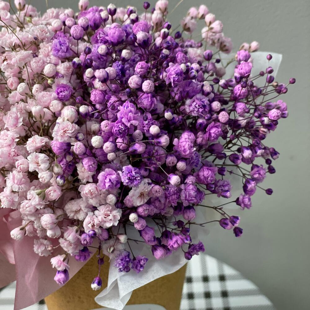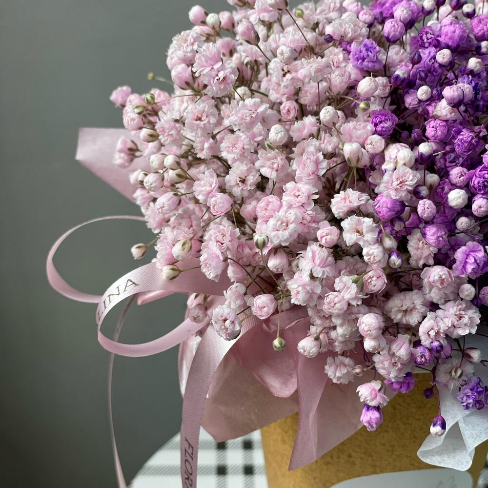 “Сиреневый туман” – композиция из гипсофилы в шляпной коробке