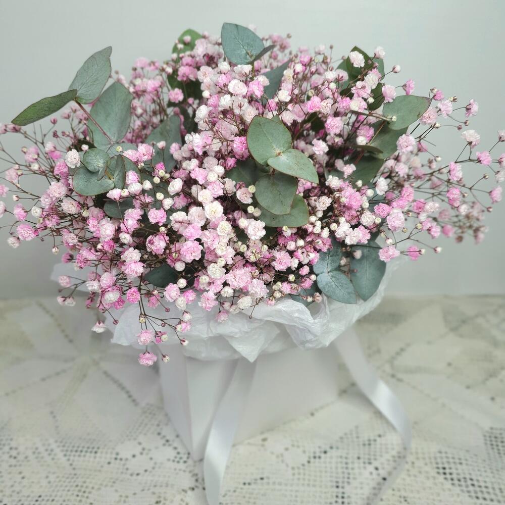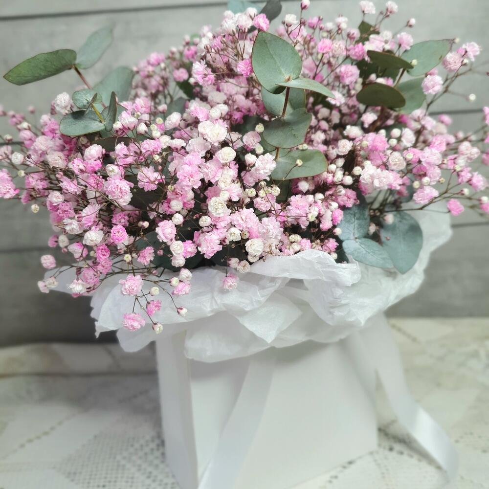 “Сиреневый туман” – композиция из гипсофилы в шляпной коробке