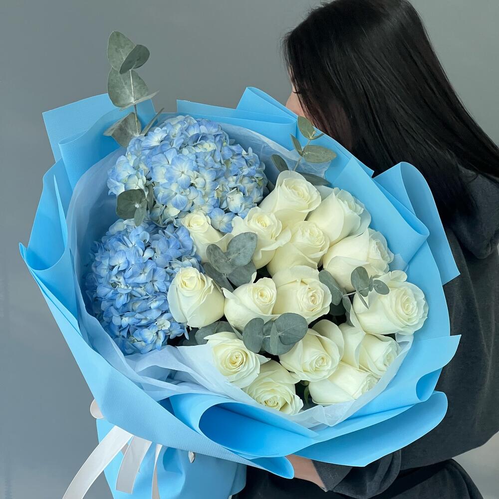 Букет из синих орхидей и розовых роз. Букет 128 ALMOND ROSES