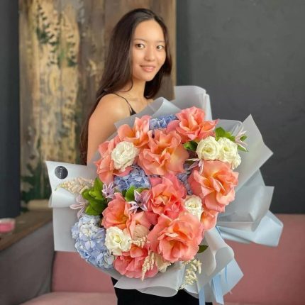 “Эвкалиптическая роскошь” гортензия и пионовидная кустовая роза