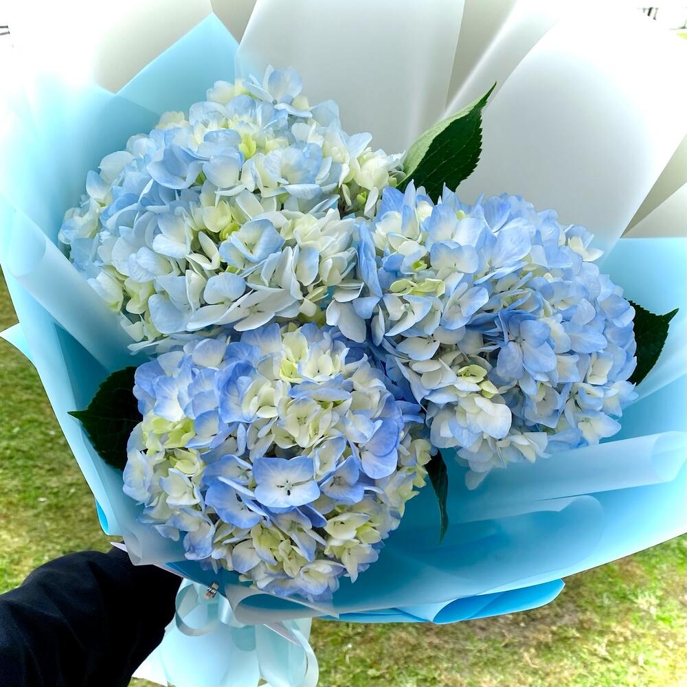 Гортензия – 3 шт.Лента атласная – 1 шт.Пленка матовая – 1 шт.Открыточка с вашими пожеланиями – 1 шт.