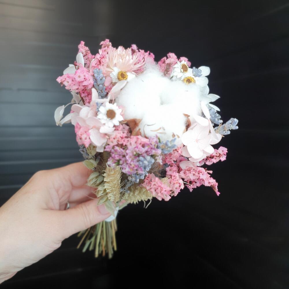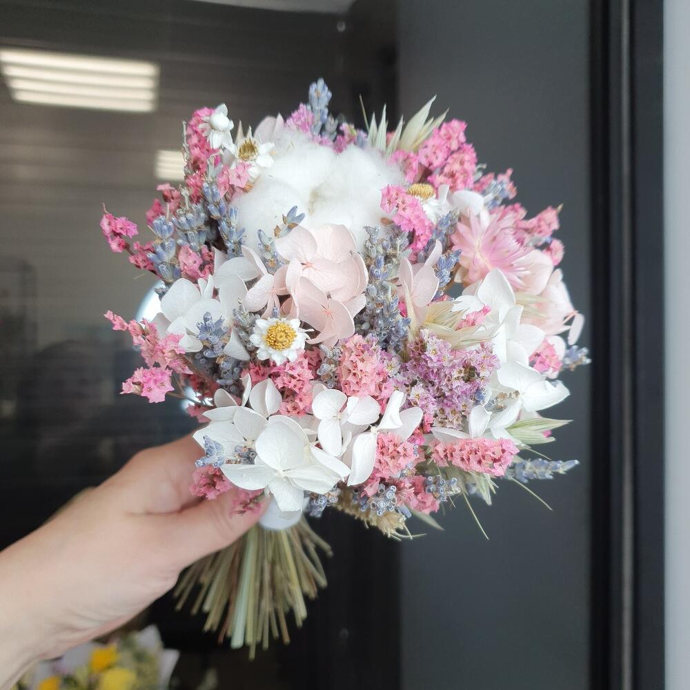 Хлопок – 2 шт.лавандер пучок – 2 шт.стабилизированная гортензия пучок – 2 шт.стабилизированный лимониум пучок – 2 шт.овес пучок – 2 шт.колоски пучок – 2 шт.амобиум пучок – 2 шт.Лента атласная – 2 шт.