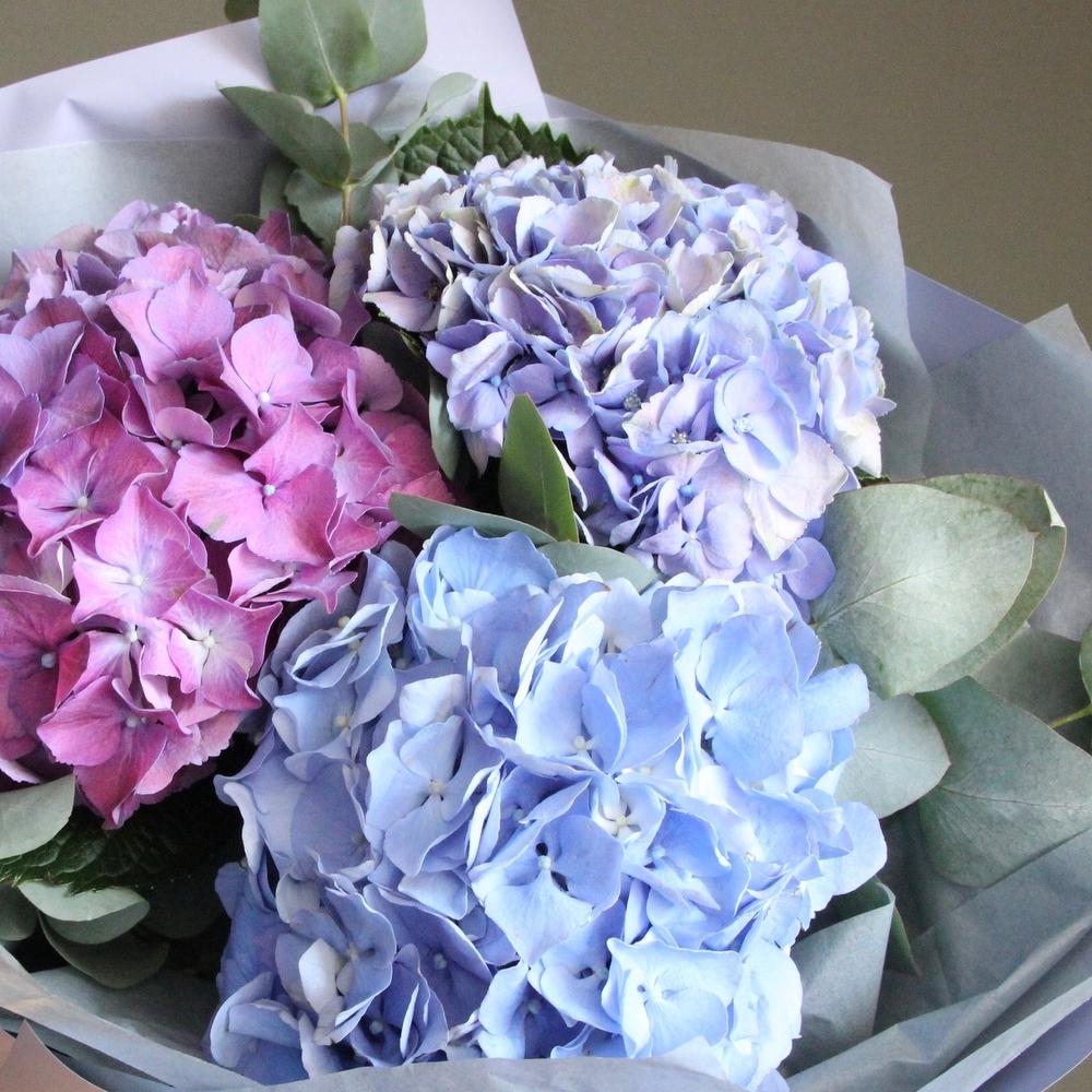 Гортензия – 3 шт.Эвкалипт – 5 шт.Тишью – 3 шт.Упаковка – 3 шт.Лента – 1 шт.