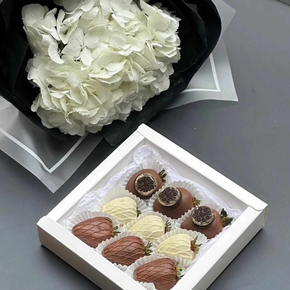 Прекрасный дуэт из клубники в шоколаде и букета гортензии, чтобы порадовать своего близкого человека.