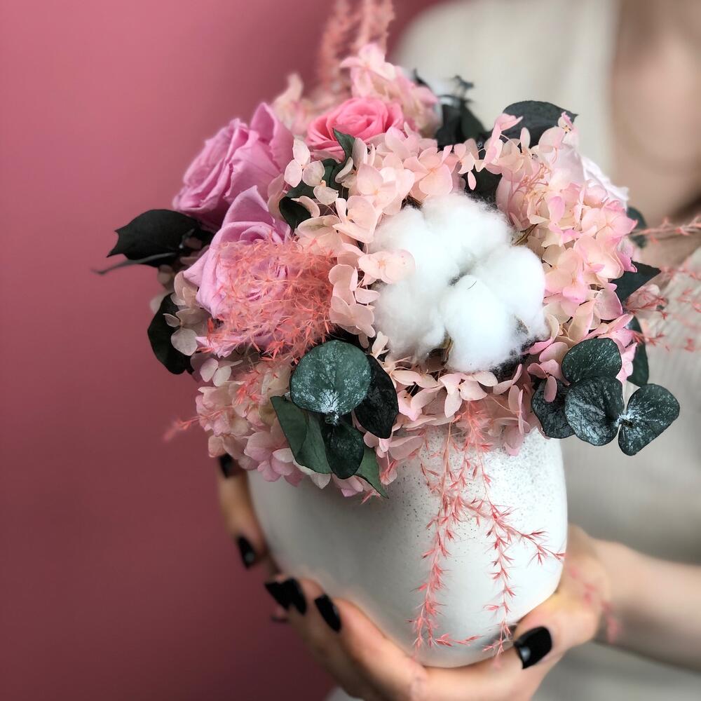 Хлопок – 3 шт.Керамическая ваза – 1 шт.гортензия стабилизированная – 15 шт.стабилизированные цветы микс – 5 шт.