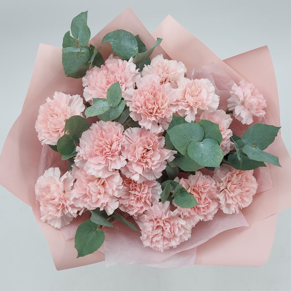 Стильный, ароматный и очень стойкий букет из розовых гвоздик с эвкалиптом. Такой букет всегда уместен и подойдёт для любого повода.