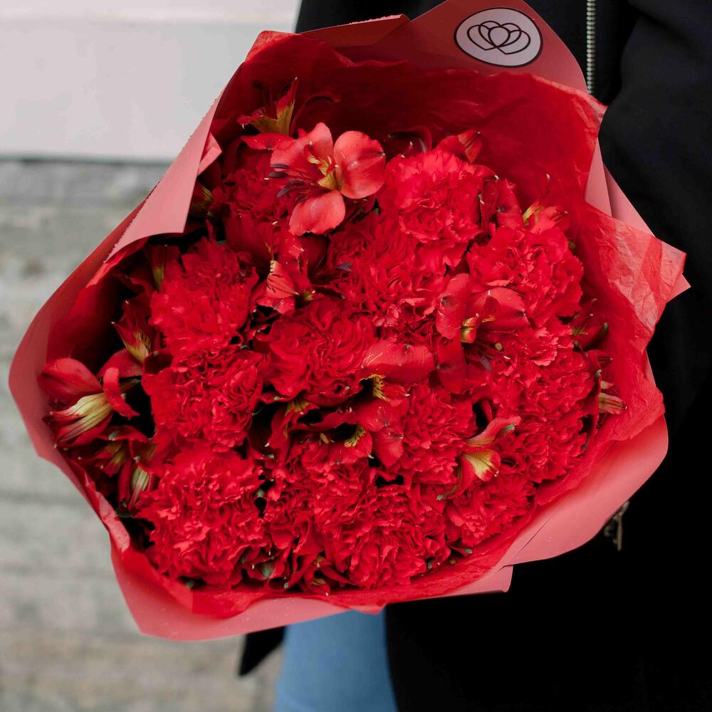 Альстромерия красная – 10 шт.Гвоздика красная – 15 шт.