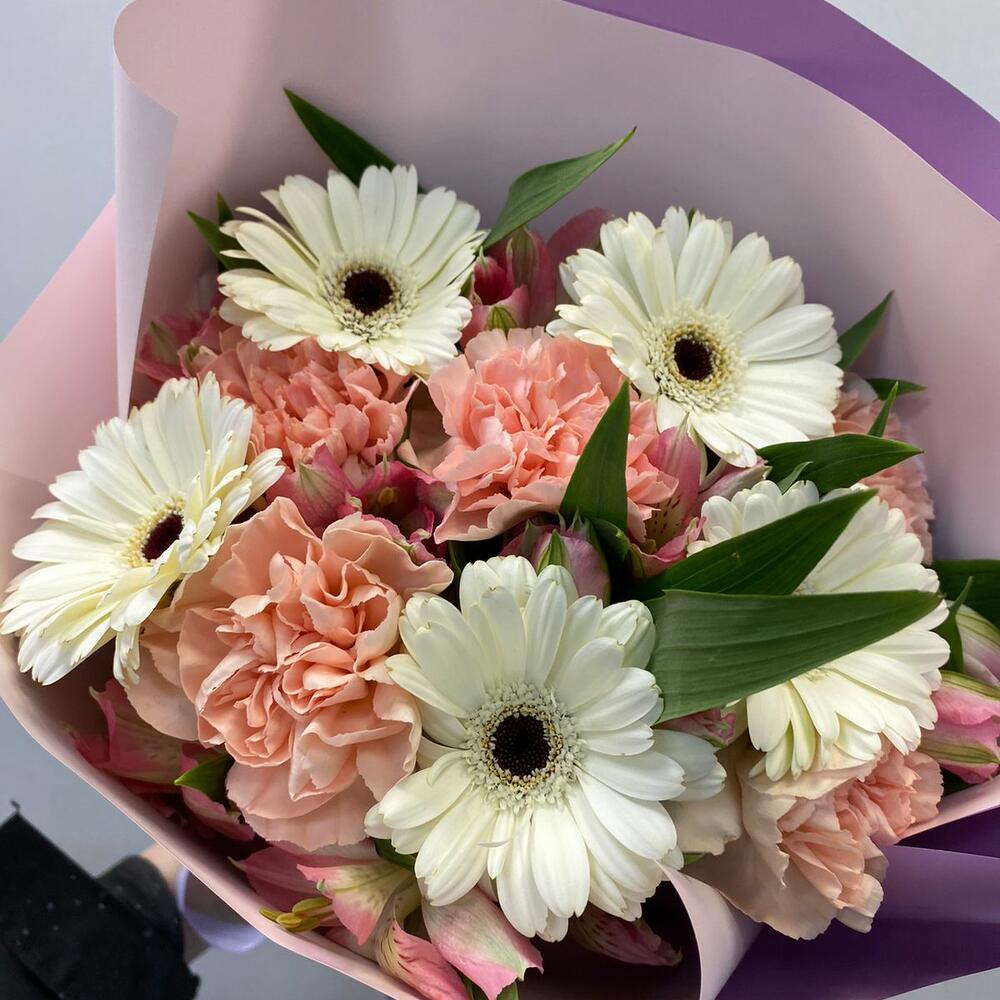альстромерия розовые – 5 шт.герберы кремовые – 5 шт.Диантус розовый – 5 шт.Упаковка матовая пленка – 1 шт.Атласная лента – 1 шт.