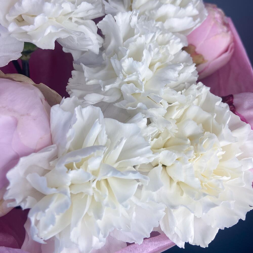 Гвоздика белая – 6 шт.Пион розовый – 3 шт.Лагурус (сухоцвет) – 3 шт.