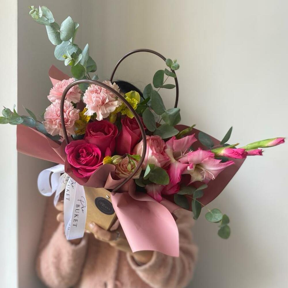 Гвоздики, Лизиантусы, Розы, Тюльпаны
