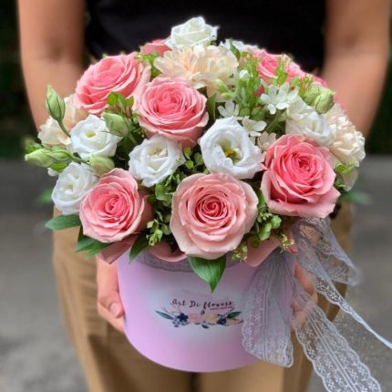 Шляпная коробка – 1 шт. Лизиантус – 4 шт. Хризантема – 1 шт. розы – 3 шт. Диантус – 5 шт. Альстромерия – 2 шт. Эвкалипт – 2 шт.