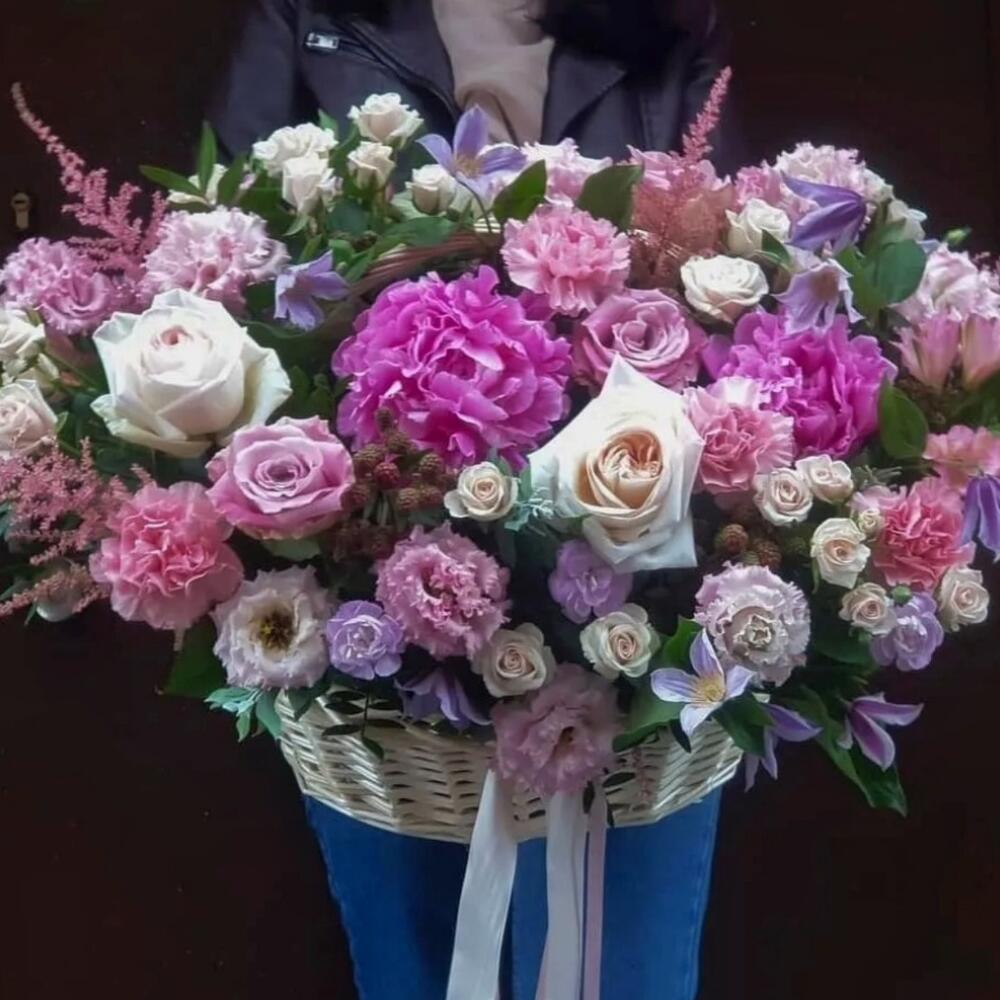 Корзина с пионами,пионовидными розами, гвоздиками и клематисом