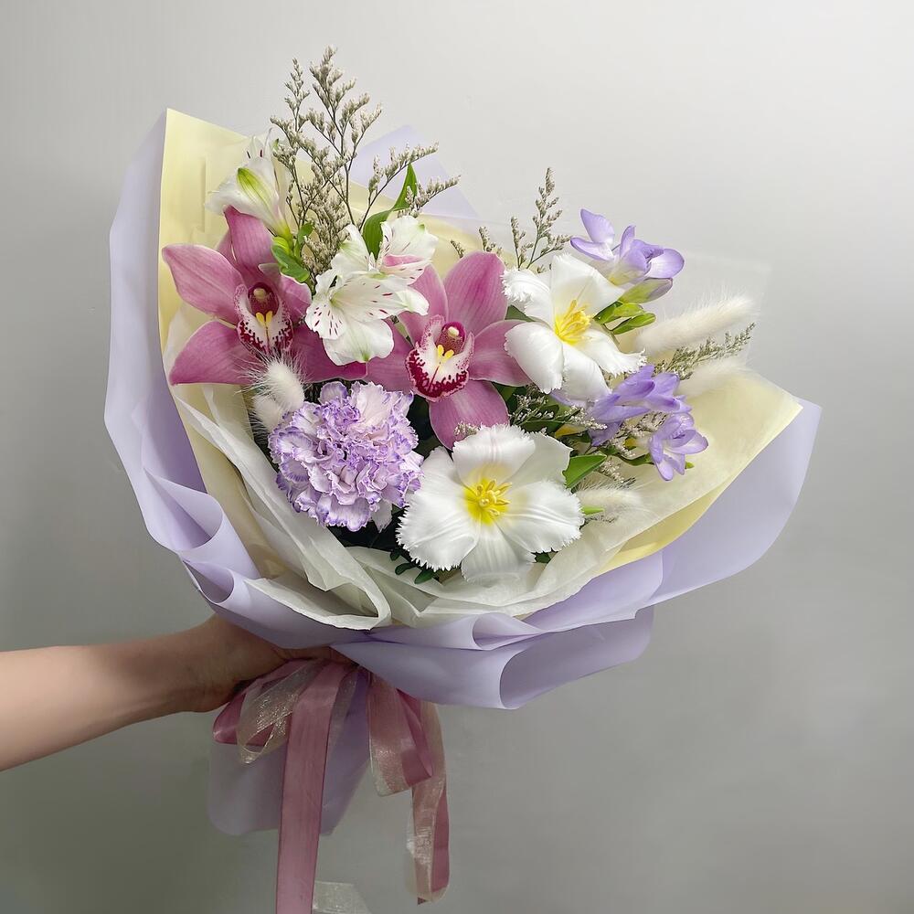 Альстромерия – 1 шт.Орхидея Цимбидиум – 2 шт.Тюльпан – 2 шт.Фрезия – 2 шт.Диантус – 1 шт.Упаковка дизайнерская – 1 шт.Лагурус – 6 шт.
