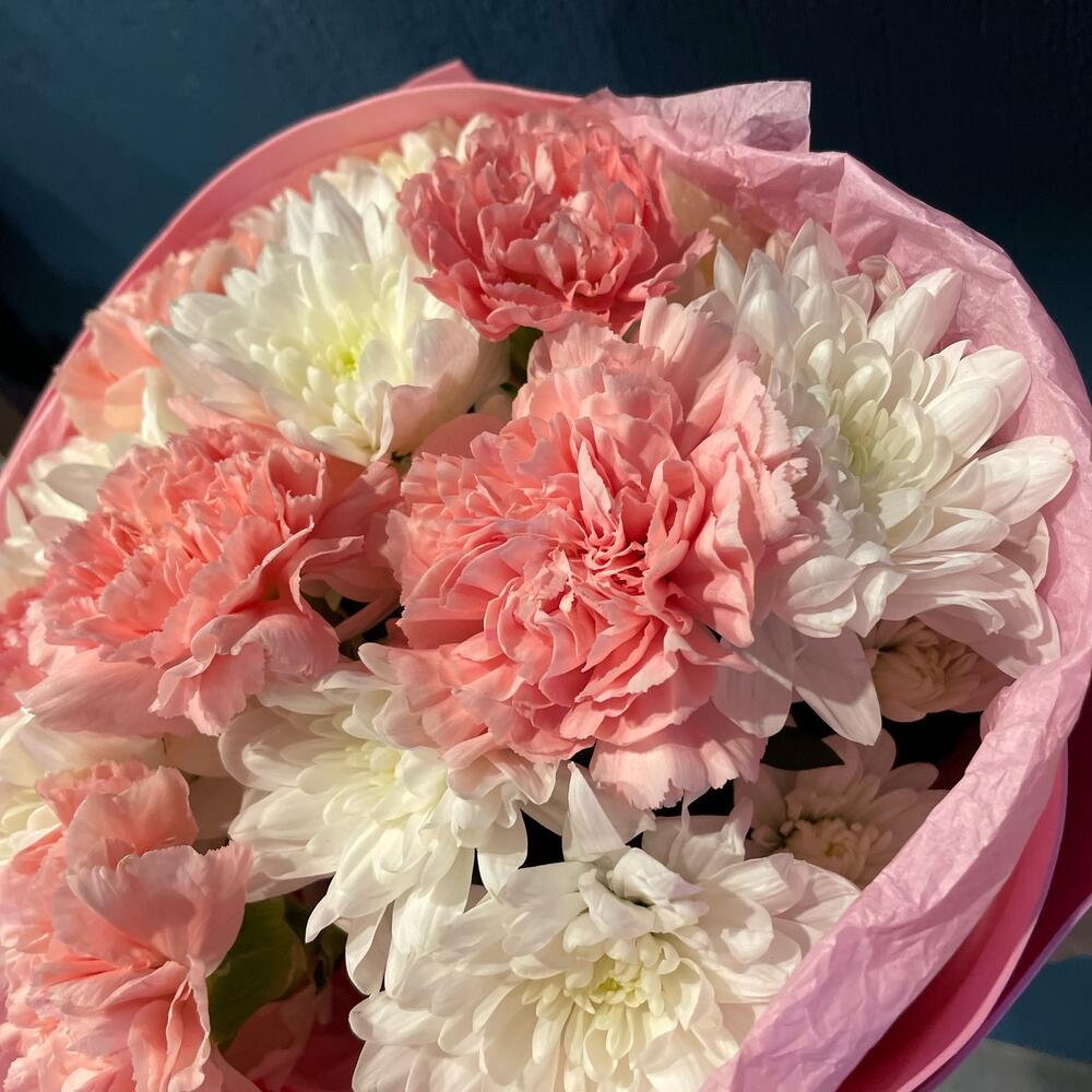 Лента атласная – 1 шт.Тишью – 1 шт.Диантус – 5 шт.Хризантема Балтика – 3 шт.Фоамиран (упаковка) – 1 шт.