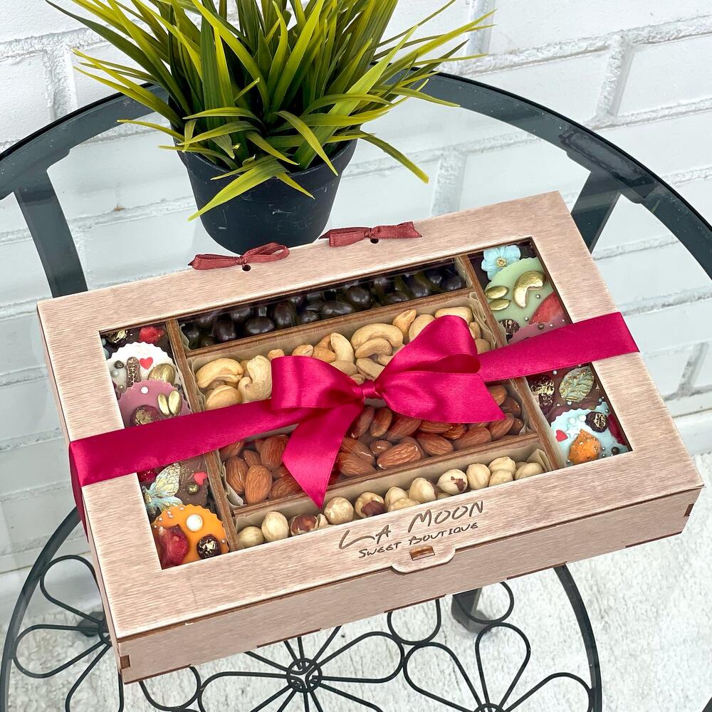 Очень красивый набор в деревянном боксе с обжаренными орехами и Бельгийским шоколадом ручной работы. Это 10 шоколадных медиантов из 6 разных вкусов- апельсинового, лимонного, молочного, тёмного, белого и рубинового.Идеальный подарок для любого праздника или в качестве знака внимания. Мы готовили для Вас с любовью! ❤️Порадуйте себя и своих любимых!