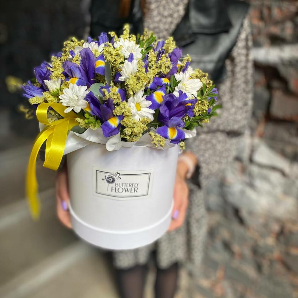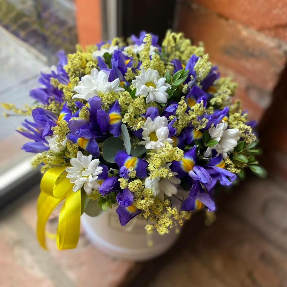 Букет из ирисов, лимониума, кустовых хризантем и самшита в шляпной коробке “Канберра”