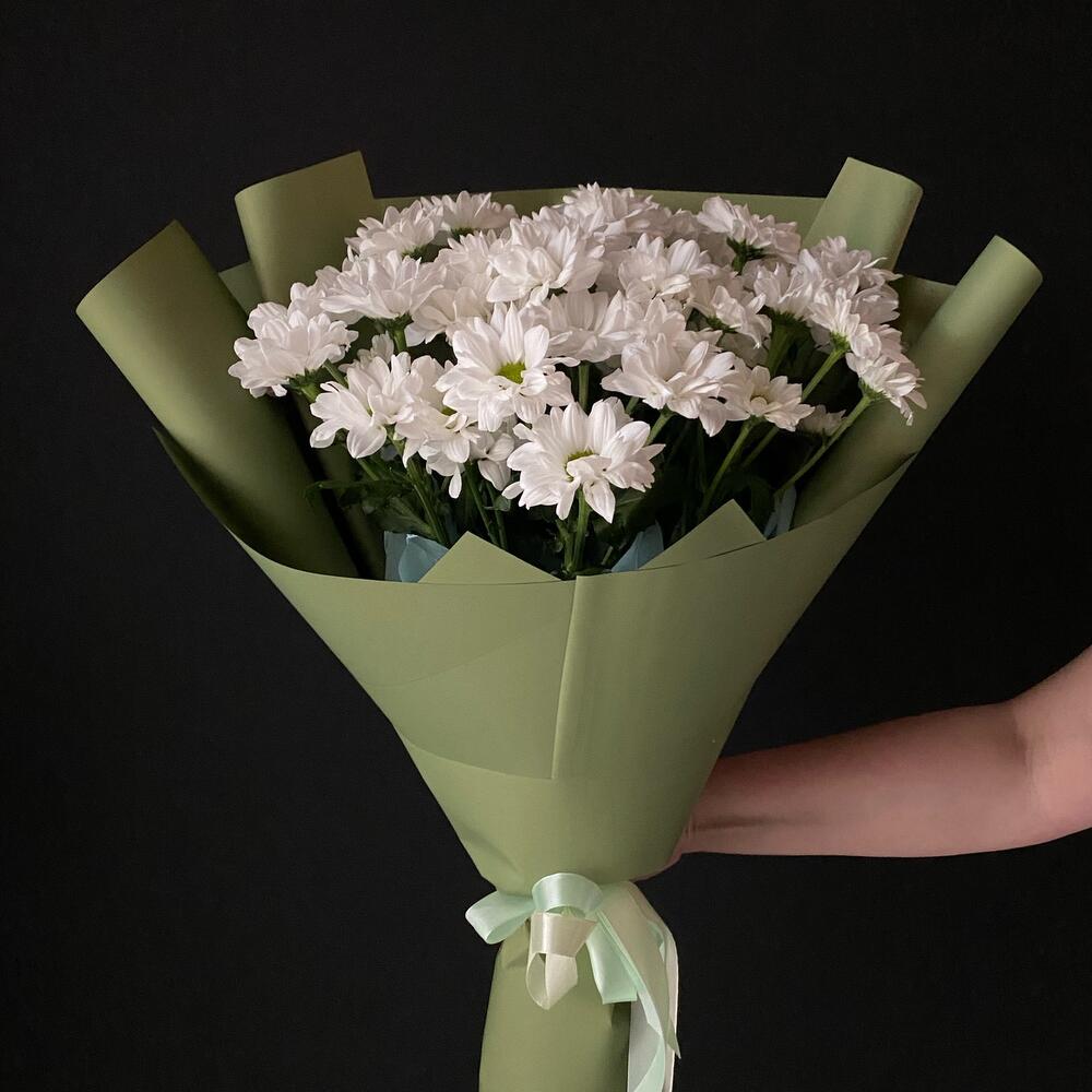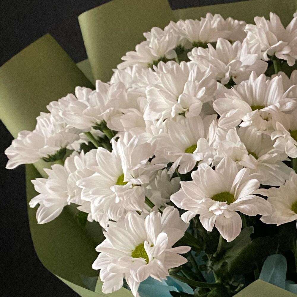 Хризантема кустовая – 7 шт. Лента атласная – 2 шт. Тишью – 2 шт. Салфетки – 4 шт. Слюда упаковка – 2 шт.