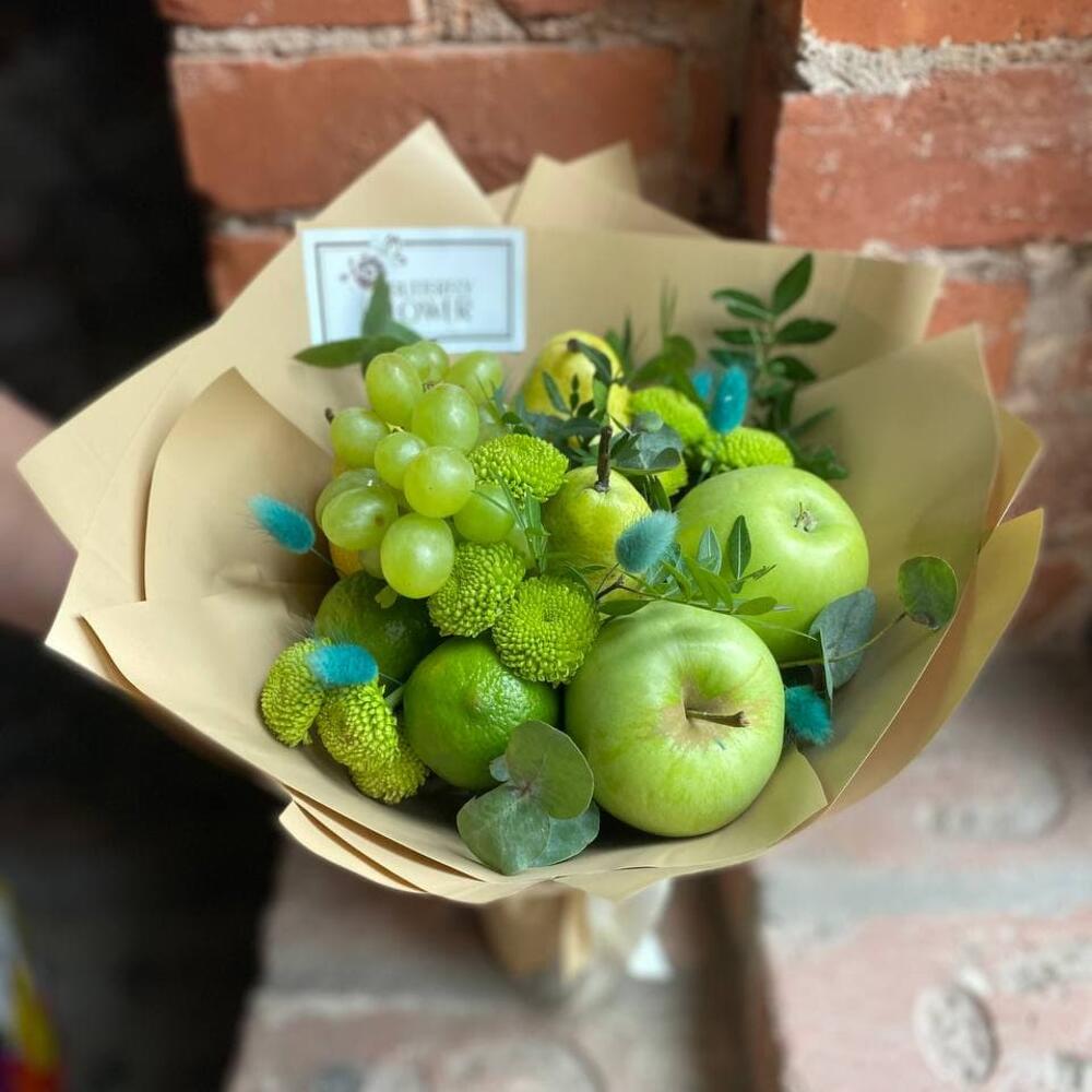Эвкалипт – 2 шт.Лента атласная – 1 шт.Яблоко – 2 шт.Крафт – 1 шт.Груша – 3 шт.Лагурус – 8 шт.Хризантема кустовая Филин Грин – 2 шт.Виноград гроздь – 1 шт.