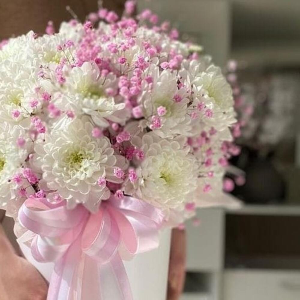 “Сиреневый туман” – композиция из гипсофилы в шляпной коробке