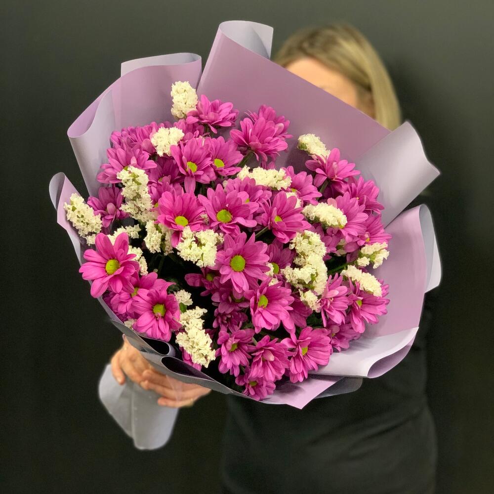 Хризантема кустовая – 7 шт.Статица – 2 шт.Упаковка дизайнерская – 1 шт.