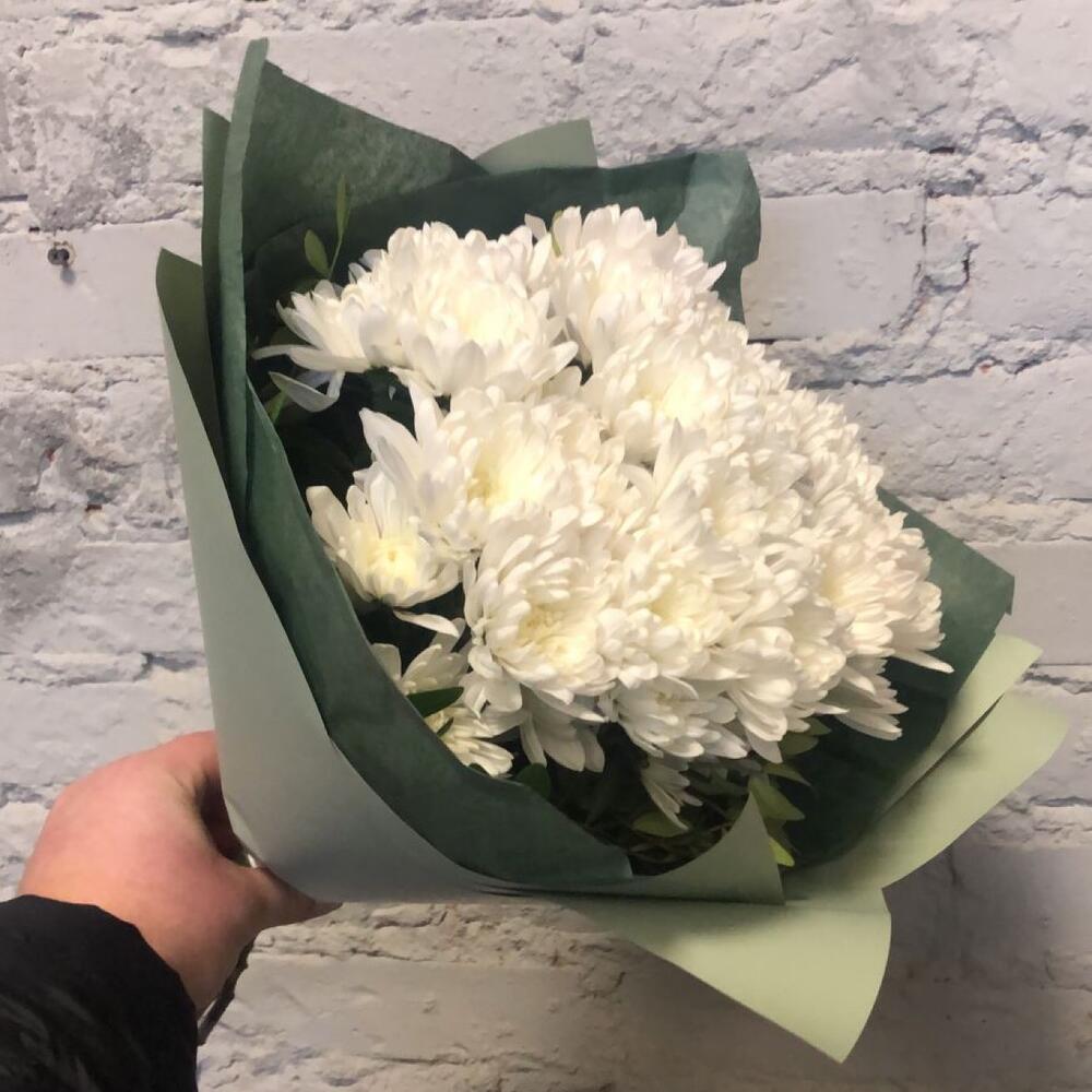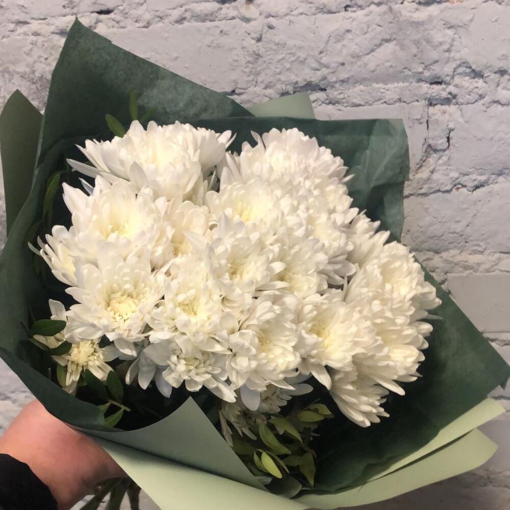 Хризантема кустовая – 7 шт.Зелень – 5 шт.Упаковка дизайнерская – 5 шт.