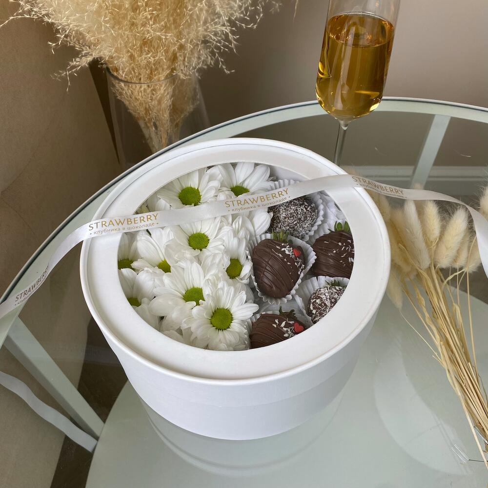 Милейший подарочный набор в круглой коробке с прозрачной крышкой хризантемы и клубники в молочном шоколаде, идеальный подарок, который никого не оставит равнодушным!Срок хранения клубники 24 часа при температуре от +2 до +8