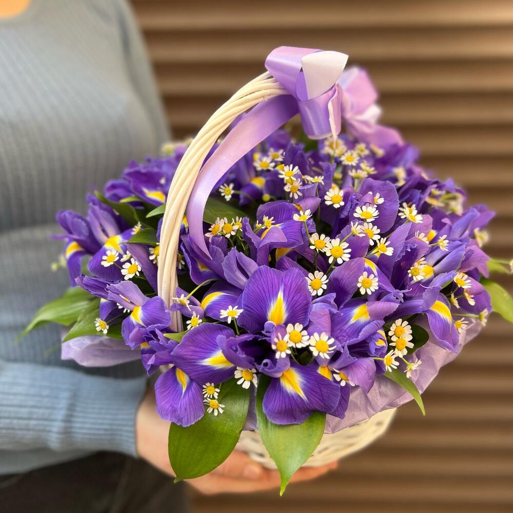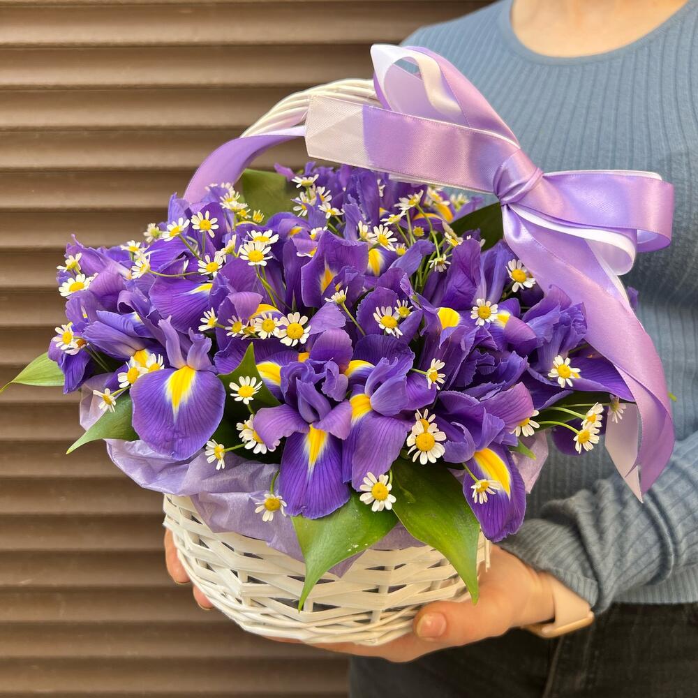 Ирис – 31 шт.Матрикария – 5 шт.Оазис флористический – 1 шт.Корзина плетеная – 1 шт.