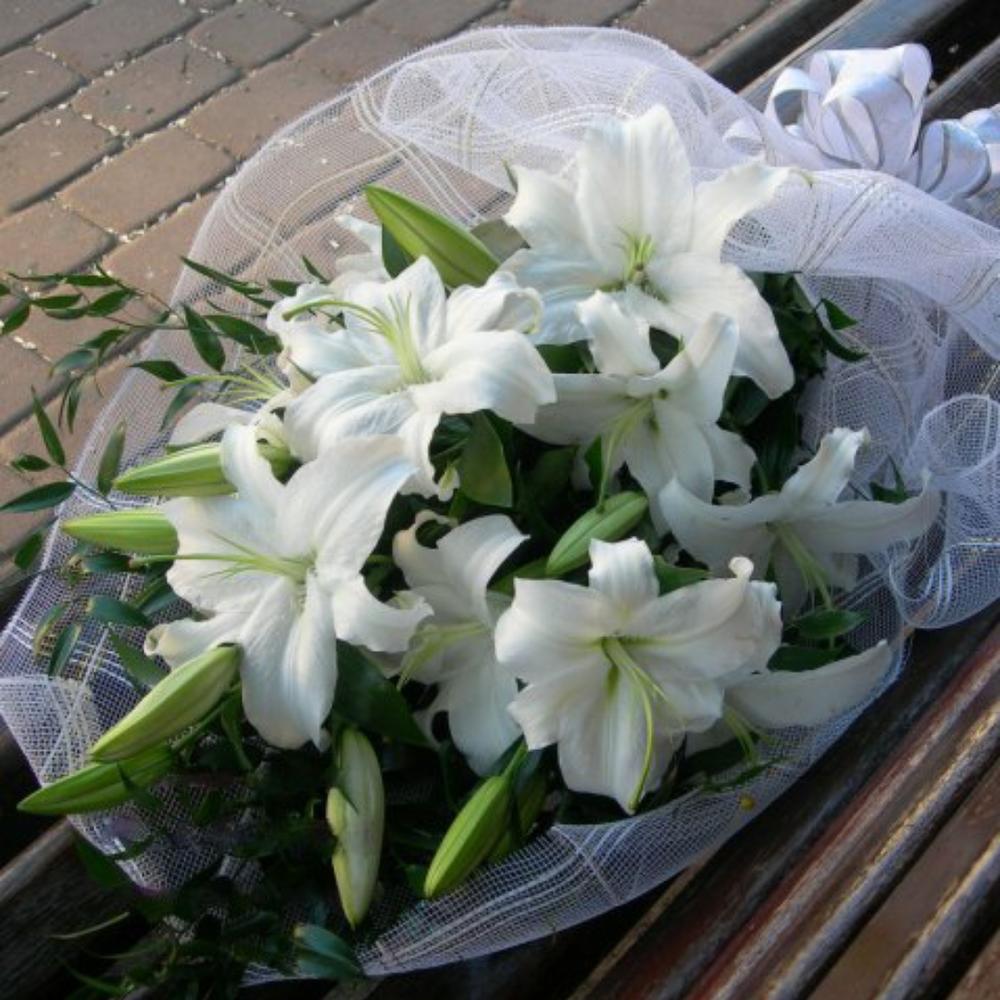 Лилия белая – 3 шт.Рускус Италия – 2 шт.Упаковка – 1 шт.Лента атласная – 1 шт.