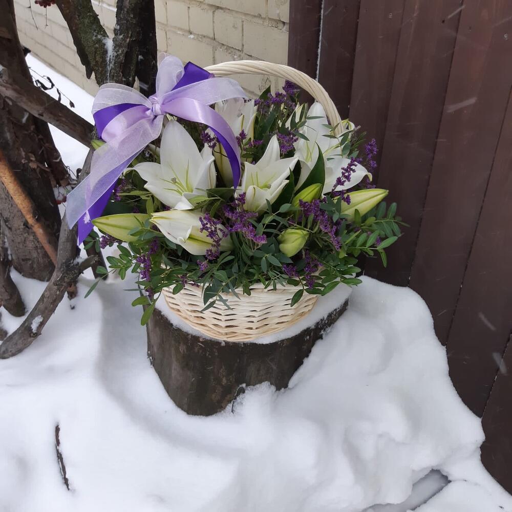 Лилия – 3 шт.Лимониум сиреневый – 3 шт.Фисташка – 5 шт.Эвкалипт – 6 шт.Корзина плетеная – 1 шт.Оазис флористический – 1 шт.Лента атласная – 2 шт.органза лента – 1 шт.